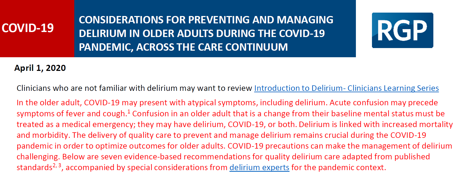RGP Toronto paper on Management of Delirium during COVID Pandemic across care continuum