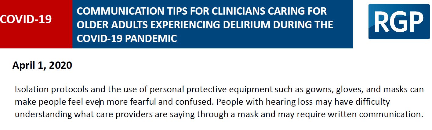 RGP Toronto paper on Communication Tips for Clinicians caring for older adults experiencing Delirium duing the COVID-19 pandemic